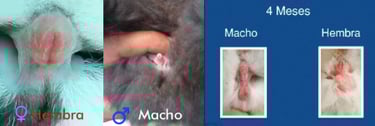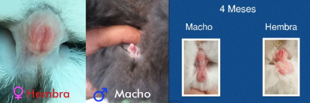 (Arriba Izquierda: Genitales del conejo a los 15 días de vida || Arriba Derecha: Genitales del conejo a los 4 meses, ya con su aspecto definitivo y adulto)