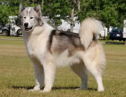 COLA: Grande y tupida, y generalmente llevada hacia arriba o enroscada sobre la espalda. Las perras maduras pueden, en ocasiones, llevar sus colas hacia abajo.