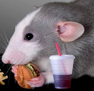 Aunque la rata “salvaje” y la de “fantasía” sean la misma especie las necesidades de ambos tipos de animal son muy distintos; es bastante complicado que una rata de “fantasía” se vea en la tesitura de tener que buscar restos entre grandes montones de basura, o de colarse en un corral para robar huevos o cazar crías. Una alimentación correcta y en la que el propietario se vuelca diariamente es imprescindible para una vida más o menos larga en las ratas, si un día les hacemos “pecar” (restos de pizza, pienso de perro…) y comer algo inadecuado no va a pasar nada, al igual que nosotros podemos estar uno o dos días comiendo comida basura, pero hacerlo de forma constante acorta la vida de cualquier ser vivo, sea cual sea su especie, y siempre se adaptará a la edad y circunstancia de la rata (bebés, hembras embarazadas, ancianas…).